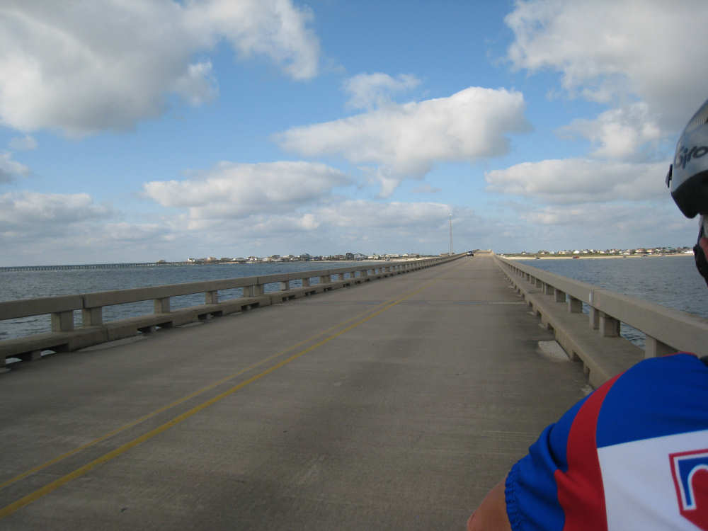 Sunday, April 06, 2008 This morning began refreshingly cool with high, puffy clouds. We packed up the tent and all our stuff and were treated to Belgian waffles, fruit, and other goodies by the cook at the RV park. By 8:15, we set off down the rest of Galveston Island towards the San Luis Pass. The island narrowed as we went and we had lots of views of the West Bay on one side and the Gulf Coast on the other. The houses along the road were grand shore houses and very interesting to look at. There were also some stretches of open land and a few pastures with cattle or horses. It was very pleasant riding along listening to the ocean surf with few cars to worry about. After about 10 miles, we came to the end of the island and went over the mile-and-a-half long San Luis bridge. The bridge was low over the water and we could see several people camping and fishing on the shores on both sides of the bridge. Approaching the bridge, there were large, fancy developments with beautiful landscaping - many flowering hedges and oleander bushes, ponds and fountains. It was very lush and luxurious looking. We were in Brazoria County on the other side of the bridge and went another 13 miles on islands with coast beaches on one side and bay or marshes on the other. There were a few small communities but mostly we rode past surf and scruffy plants. Very scenic. We got to the end of the islands and reached another milestone - this was the southernmost point of our trip! From there, we took a right turn onto Route 332, going over a very high bridge over another Intracoastal Waterway. This road went on for about 20 miles and was mostly lined with industrial buildings and refineries. It was not at all scenic for the most part, although it did have a good shoulder and we had a mild tail wind. From here, we got onto Rt. 288, which we took for the next 40 miles, nearly all the rest of the way to our destination. By this time, the sky was completely cloudless and becoming very warm. We went through a few interesting areas, especially the town of Angleton, the county seat of Brazoria County, which had some interesting buildings, but we were not much in the mood for stopping to sight-see. 288 had a good shoulder most of the time, although one long stretch had an interesting variation on rumble strips - they had these white blobs that looked like giant chiclets spaced evenly across the shoulder that Pat had to try to steer us between. We were glad when that bit was over. The sun was quite scorching, even though the humidity was low so the temperature wasn't unpleasant, but our sunblock didn't seem to be a match for the Texas sun. It was a long day - 72 miles in 6 hours of bike time - and we arrived hot, sweaty and tired at Sarah's house by 4:45. We played with Amanda & Rand and talked with Sarah for a while, barely having the energy to update our website - but we couldn't let all our readers down! Tomorrow we have a much-needed rest day, which will be filled up with a long list of things we need to do. |