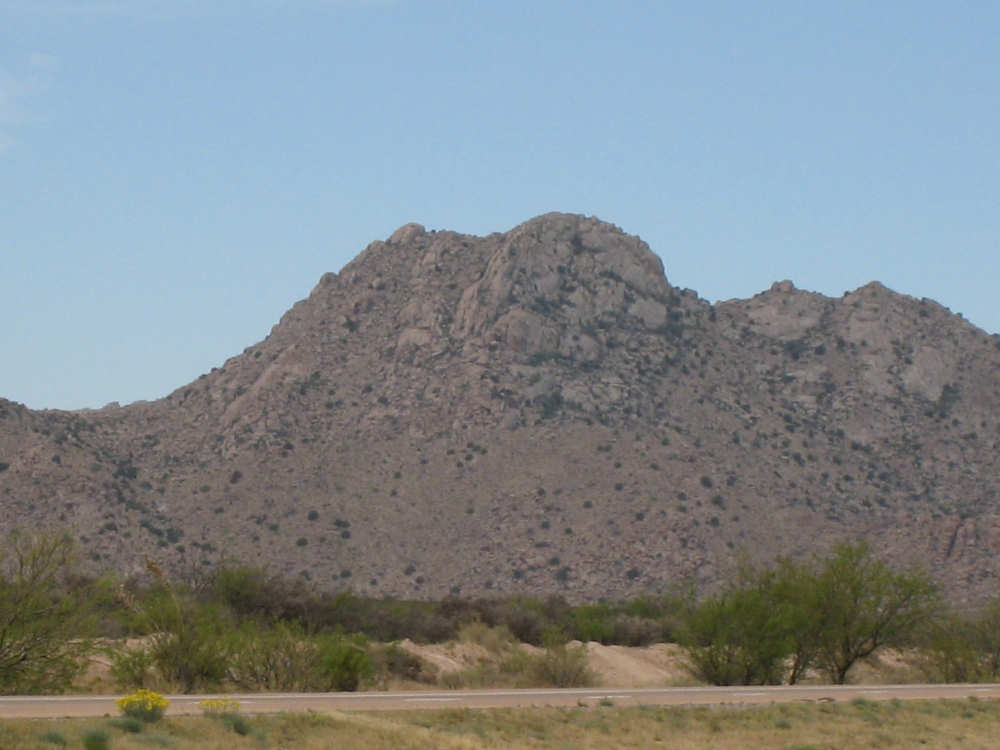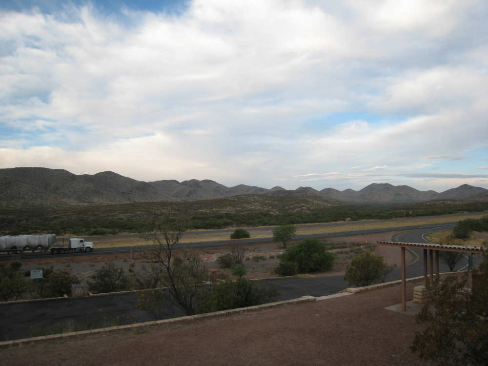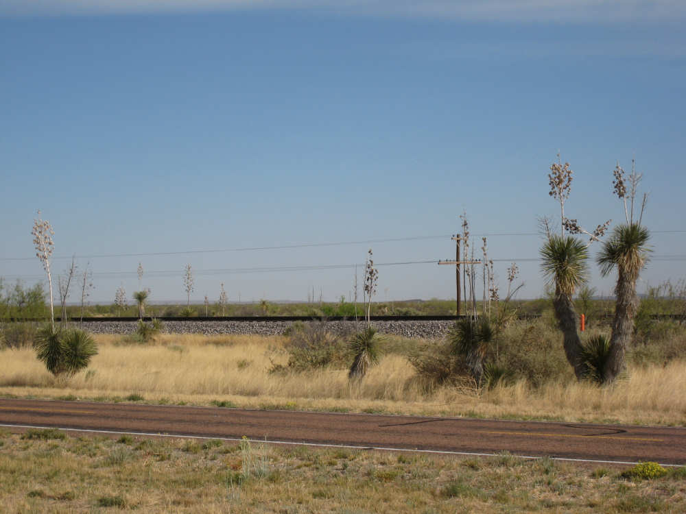 Wednesday, April 23, 2008 Today was an easy day. We started out, after breakfast at a nearby truck stop, at 7:40 and stayed on I-10 all day. We arrived at Fort Hancock at 3 pm, which was actually 2 pm since the time changed soon after we started out. We went 67 miles in 5 hours and 40 minutes of bike time, a nice 12 mph average. It was, of course, mostly downhill or level and I-10 had a nice shoulder surface all the way. We had a calm wind in the morning and our usual head wind after noon, often very gusty, but overall, it was very manageable. Not many highlights today - one of the drawbacks of being on a highway, I guess. We had to dodge some road work signs and cones, but not much actual work was being done on the road and the 2 workers we saw were not put out by our being in their work area. We stopped at a 'scenic overlook' but found out you had to climb a mountain to get the overlook, which we didn't feel like doing. But we did climb up as far as they had steps and got a shot of the mountains across the highway. We saw a phenomenal flowering bush there as well and got some pictures of that. Later in the day, we passed a picnic area that had little tipi-style covers over the picnic tables - it looked very nice. We are close to the Mexican border again (it was further south the last few days), and we saw another immigration checkpoint on the east-bound side of the highway. The traffic was shunted onto the frontage road on that side and went through one by one; it was quite backed up. The traffic wasn't bad today, but we could tell it was getting heavier as we get closer to El Paso. We're only about 60 miles from it now and will get there tomorrow. We saw 2 more rabbits today and saw 2 animals that looked like pronghorn deer to me. They were right by the side of the road but ran off when they saw us approach. I got a pretty good shot of them as they got up to the railroad tracks. Yes, we're next to a railroad track again today and saw a number of freight trains go by. Other than that, we mostly saw mountains, lots of mountains, close up and far away. We had a stopover town, Sierra Blanca, at about midpoint today, where we had a very nice lunch. Near the town is the mountain called Sierra Blanca, which is whitish-looking from some angles, darker from others. It's almost 6,900 feet high. We started today at about 4,600 feet in Van Horn and dropped very gradually to about 3,600. A little past Sierra Blanca on the south side of I-10 was an impressive range called the Quitman Mountains. After that, we had a nice descent to a flatter plain with mountains around the edges. It had several arroyos, which I think is Spanish for 'mostly dry river that fills up very, very fast when it rains'. Or something like that. The soil seemed to be a sandy/rocky mix, but it was astonishing how many bushes and flowers grew in it. We're still trying to decide whether to make another easy day of it tomorrow and stay on I-10 or try the more 'scenic' (you know what that means by now) Hwy. 20. A nice gentleman we were talking with this morning at breakfast, whose name we stupidly forgot to ask (if you're reading this, Mr. Tru-Value, please email us your name), didn't seem to think 20 was a great idea, but I-10 will be awfully busy in El Paso. Maybe at dinner we'll ask around some more. Or we'll just try 20 and pop back over to I-10 if it's too awful. It does run along the Rio Grande, which I think would be interesting to see some more. |