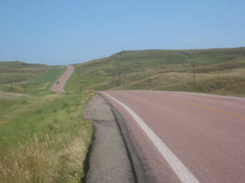 Wednesday, August 06, 2008 It stormed again last night and this morning was cloudy, so we left Fort Thompson expecting to get rained on again. However, it quickly cleared up and became hot and sunny. We started out at 7:45 and followed Indian Road 4 right along the Missouri River for about 8 miles. The hills along the river were very pretty; the terrain was mostly gentle hills with grasses for pasture and some small farms. The Indian Road was in bad repair most of the way, but it was flat. We then turned onto State Road 50, which we followed for most of the rest of the day. We soon had 2 long, steep hills to climb, but it was still early in the day so it wasn't too hot and the hills around us were spectacular. We came into Chamberlain, the only town of the day, after a steep descent from the second hill. Chamberlain is the county seat of Brule County and is located right on the river. There were 2 interesting bridges across the river in town, and we saw two kids playing on a beach on the river as we went through town. There was also a historic marker, nearly unintelligible, but with some interesting information. We stopped at a convenience store to have a snack and top up our camelbaks, since this would be our only chance to do so all day. We had only come 22 miles out of our 70 mile day, so we had to resort to the warm water in our bottles before the day was over. While we were at the store, a guy came over and said he had seen us on the road yesterday, chugging up a hill, and again today, going up the hill into Chamberlain. He said he really sympathized with us because he sometimes biked between Chamberlain & Fort Thompson himself. After Chamberlain, we veered away from the river until the end of the day. We were back in the immense croplands now and we were still climbing, only more gradually now and over a longer distance. A few clouds had developed so we had occasional cloud cover and the wind was a little stronger at times, so it cooled us off some, but it was basically pretty hot most of the afternoon. The road was pretty smooth except for long cracks that went all the way across the road and shoulder at frequent intervals. They were sometimes deep enough to be quite jarring on us and the bike, which was unpleasant. Other than that, the road surface was pretty smooth. South Dakota uses the same surface technique that Texas does - chip seal, I think they call it, where they put down a layer of tar and then spread gravel over it. This made the Texas roads awfully rough, but South Dakota must use smaller gravel because they are generally much smoother, even when freshly done. Highlights from today, besides the beautiful hills before Chamberlain, were: a huge lake, called Red Lake that we passed shortly after Chamberlain; a short range of hills, called Bijoux Hills, that we went through and then behind; and another large piece of farm equipment that passed us on the road. The farm equipment seemed to be some sort of harvester and when we first saw it coming toward us, it was taking up the entire road. We stopped to let it pass and to take pictures of it, but we didn't really need to. As he approached, the driver moved over to the side of the road and it seemed that he moved the blades over as well. They originally stuck out evenly on both sides of the vehicle (they were what was taking up the whole width of the road), but as he passed us, we saw that the blades were farther over to the opposite side of the road. After he passed, they had moved back to the center. We had reached the peak of our long climb after we passed the Bijoux Hills, so our pace picked up a little. It was still a lot of up and down, though, and we were getting tired and hot, but the end was now less than 20 miles away so we pushed ourselves to get there as soon as we could. There wasn't much of interest until we made our final turn toward the river, onto SR 44. The last downhill to the river was really pretty, although we were a little daunted to see the road we would start off on tomorrow morning, right across the river - it looked pretty long and steep, but we'll worry about that tomorrow. We found the marina where we would stay in a little cabin overlooking the river. We checked in at 5:30 and quickly decided we would have dinner before doing anything else. There were 2 women running the place, a server and a cook who was the sister of the owner. The owner was away at Sturgis, South Dakota, catering an affair at the huge motorcycle rally that was going on there. We took some pictures of the place after dinner and the owner's sister was kind enough to offer to take a picture of us in front of the marina. Then we went up to our cabin to unload, shower and work on the website. Since our cellphone connection doesn't work here, we had to use the marina's internet access which only works in the restaurant so we are limited by the restaurant's hours. We ended the day at a little over 70 miles in under 7-1/2 bike hours, a better average than we expected. Tomorrow, at least, will be a short day, but the day after will be even longer than today. Still, the next day will be a rest day again. |