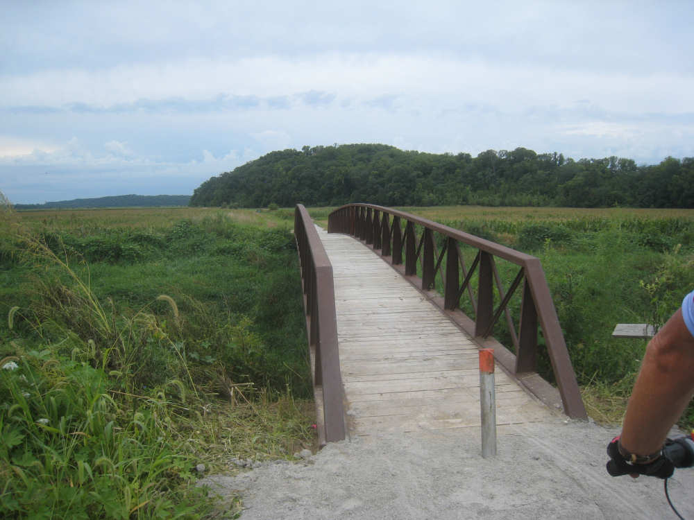 Thursday, August 14, 2008 We had an interesting day in Nebraska today. We left at 7:40 with overcast skies and a calm wind, conditions that lasted pretty much all day. After admiring the Nebraska hills from across the river in Iowa for 2 days, we were now in them. In fact, we started out on probably the steepest climb of the day, coming out of Nebraska City. The views were stunning, though, such wide vistas and such green landscapes. They were mostly crops, of course, with interesting terracing and field patterns. We were going to be on a bike trail (Steamboat Trace) for about 20 miles - 40% of our day's route - and we were a little concerned that it would be, #1 findable, and #2 in good shape. Well, we didn't have any trouble finding it; it was the most well-marked bike trail we've seen yet. And the surface was good, even though it was gravel. We were actually impressed at how well-maintained it was. It occurred to us that it was a good thing that it hadn't rained the night before, or it might have been quite messy. The trail took us through woods and crop fields, alternately, and moved close to the Missouri River off and on. We had Iowa on the other side of the Missouri at first, and then Missouri, as we moved south along the river. At one point, when we were in crop fields, we saw these interesting structures every so often at the edge of the trail that looked like birdhouses. We took a picture of one that you can see below. As we were getting back on the bike, we thought we heard voices behind us, and a little while later we saw 3 guys on bikes coming up from behind. They passed us easily, exchanging greetings as they went. We caught up with them later, though, when we stopped for lunch, and chatted some more. Our first town of the day was Peru, a small town that had an old train depot and a campground right on the trail. The train depot had been converted to bathrooms, conveniently enough. They had some bulletin boards with pictures of local birds and a newspaper write-up of Roland Sherman, who did some sculpting of the sandstone rocks on the trail ahead. As we got to the area with his work, we were surprised to find a sign calling it the Roland Sherman Memorial area. The newspaper article was about 16 years old and it said he was 63; I guess he must have died since then. At any rate, we saw a few of his sculptings, especially one of his more "whimsical" ones, as well as a few less artistic graffiti, in some very impressive sandstone cliffs. We continued down the trail past more woods, more fields, coming very close to the river again, and finally popping out into the city of Brownville. We were surprised at how picturesque Brownville was, we expected another tiny town with few services. There was supposed to be a restaurant there, though, and when we asked a couple of locals, they quickly pointed us a block down to a wonderful little cafe. We found our local bikers there, nearly done with their lunch. After a scrumptious lunch, we moved on through the town, seeing lots of other interesting buildings - an opera house (!), a folk art museum, and a winery built over a stream. Quite an amazing little Nebraska town. After Brownville, we climbed another short, steep hill and got treated to a roller-coaster ride of one hill after another for several miles after that. None of them were very steep or long, so it wasn't all that bad a ride, and again, the views were beautiful. We did notice that it felt a little cooler than we expected and then noticed that the clouds had gotten a little more threatening, and hmmm, doesn't it look like it might be raining up ahead there? NOAA had given it a 30% chance and it looked like we might be riding into that 30% before the end of the day. We plugged on and soon enough, came into Falls City, our destination. We turned down the street where our hotel was and were surprised to find the streets were all brick! We were even more surprised by the sight of our hotel; it looked like an old-fashioned high-rise hotel. The hotel was being restored, we had been warned when we made the reservation, and only a block of rooms was available. We didn't realize that it was being restored to its original 1924 elegance - it was all very fancy. We'll have to get you some pictures of it tomorrow morning as we leave. We arrived at our hotel at 2:50, without being rained on, having had a very interesting and enjoyable day. We went nearly 54 miles in nearly 5 hours and 40 minutes of bike time. And we have tons of pictures. |
