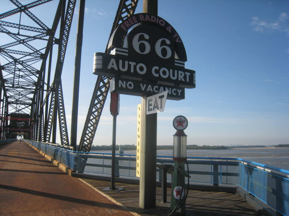 Monday, August 25, 2008 Beautiful day today - the humidity was much lower and it was a little cooler than it's been. The wind was stronger than we expected, and was a headwind, naturally, so it slowed us down some, but at least it was much less hilly than Missouri had been. We started out with a short ride to the Chain of Rocks Bridge, a pedestrian/bike bridge over the Mississippi River. We were very lucky to run into another bicyclist going there as well. This was Mike, who makes this trip every day on his way to work. He asked us about our trip as we were biking over to the bridge and then led us to its entrance. When we got to the bridge, we found out it was closed. The sign by the bridge clearly stated it was open 1/2 hour before sunrise, and it was definitely well after sunrise at that point. Mike wasn't worried, though, and convinced us that it would not be a long wait. He also said that the alternative, going on the nearby 270 bridge, was "suicidal" - lots of traffic, especially trucks, and no shoulder. There was another bridge farther north, as well, but it didn't have the charm of this bridge. The Chain of Rocks Bridge is a restored Route 66 bridge and had several relics from that era, as well as a 1929 restored fire truck. The Chain of Rocks refers to a string of rocks across the Mississippi, referred to in the Lewis & Clark journals, that blocks navigation on the river. There is a canal alongside the river that boats and barges can use to get by this natural obstruction. While we waited for someone to come unlock the gate across the bridge, Mike whiled away the time telling us about the bridge and the Route 66 mementoes, and explaining how to get on the trail at the other end of the bridge. If he hadn't been there, we wouldn't have known that we should wait and might have taken our chances on 270. Someone did finally come and open the gate and the bridge was delightful. It was especially nice that we could stop and take pictures without worrying about traffic. In the middle of the bridge, we crossed into Illinois, our 26th state! We didn't have a welcome sign, but the boundary was marked by old Route 66 signs, one from Missouri, and one from Illinois. At the end of the bridge, we were on Choteau Island and crossed the canal on another bridge, then went on a bike trail alongside the canal to get to the Lewis & Clark Park. Mike had zipped ahead by now so as not to be late for work so we were on our own now. We got to the end of the canal, where it rejoined the Mississippi, and we thought the park was just a little ways ahead so we continued along the trail. We saw what we thought was the Lewis & Clark monument, a beautiful structure that looked like one solid building when we first saw it, but turned out to be 2 towers joined together by little bridges when we saw it from the side. It was out in the middle of a field, though, apparently not complete yet, or at least not open. We soon saw from our GPS that we had gone past the access to the river where we had hoped to see the confluence of the Missouri and the Mississippi, but we hadn't seen anyway to get to the river since we left the canal. We retraced our steps until we were almost back to the canal when we saw another guy on a bike who confirmed that the only river access he knew of was at the Chain of Rocks bridge and then about 4-5 miles north of there. That was very disappointing and we went on our way, having already taken much more time than we expected there. It occurred to us later that we actually had seen the confluence right where the canal joined the Mississippi, and checking our maps tonight confirmed that. It certainly wasn't as impressive as we had imagined, but that point was the last time we saw the two mighty rivers. We passed through a few towns on the rest of today's journey, as well as several crop fields, mostly corn and soybeans, as usual. Our first town was Edwardsville, the county seat of Madison County and home of a huge Southern Illinois University campus. We passed the campus four miles before we came to the town. The town was very elegant and quaint, clearly a university town in its abundance of eating places and quirky shops. We had lunch at a nice place across from the county courthouse and administration building, both very impressive structures. Our next town was Hamel, a much smaller town, but with the distinction of being on the legendary Route 66, something they touted at every turn. We went through another small town, Alhambra, and then skirted the edge of a larger town, Greenville. Tree farms and nurseries seemed to be a thriving business along the route. We spent most of the day on two-lane roads, mostly without shoulders but in good repair. Some of the roads had a fair bit of traffic, but the Illinois drivers have been just as courteous as we've experienced in each other state, giving us a wide berth as they passed and slowing down behind us when it wasn't safe to pass. We ended the day on Rt. 40, parallel and close to I-70, which was a noisy road with a lot of trucks on it. This meant that most of the traffic was on I-70, which was a very good thing for us. It was a long day - we started at 8 this morning and arrived at our motel in Vandalia at 6. We did a little over 73 miles in 7 hours and 20 minutes, not bad considering the headwind. Our motel had a restaurant right next door, which makes life so much easier for us - and they open at 6 for breakfast! Tomorrow's another long day and we'll have another east wind, but it will also be fairly flat. |