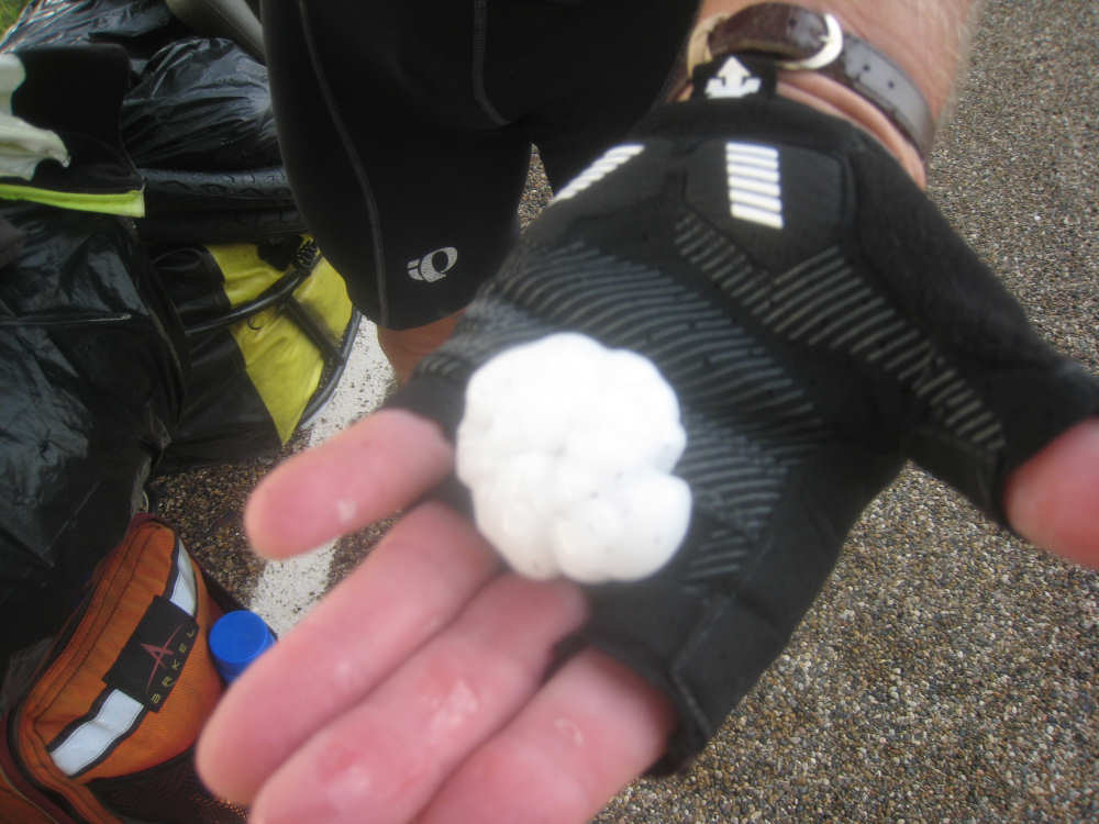 Monday, July 28, 2008 Well, the good news was we kept cool and didn't have any bugs biting us. The weather was, let's see, Pat's word for it was "exciting". That would not have been my word, but we'll let it stand. When we left the motel at 6:50 it was quite gray and muggy, almost foggy. It seemed very strange, we hadn't seen weather like that for weeks. We decided to wrap everything in the plastic bags from the start, to be on the safe side. While we were eating breakfast, the weather broke. It got very dark, horrendously windy, and started to rain very hard. Our bike blew over and we went out to pick it up and move it behind the restaurant where it would be sheltered from the wind, and then ran 100 feet to the convenience store to get ice for our camelbaks. In the 15-20 seconds it took us to do all that, we had gotten completely drenched, much to the amusement of the people in the store. By the time we were done with the camelbaks, though, the rain had quieted down and we were able to set off. It seemed very odd that the wind we were feeling (a head wind again, dammit!) didn't seem to coincide with the direction the clouds were moving. We saw some very dark clouds behind us and thought they wouldn't be a problem, but then realized the clouds were gaining on us. At one point, we turned to the north and the clouds were right next to us. The rain falling from them was curved! I guess the cloud moving east and the wind blowing west made the rain sweep back. We tried to get a picture of it, I'm not sure it showed up too well. The rain caught up with us soon enough - just when we had started to dry off from the earlier rain. Then we noticed that the rain was hitting rather hard and saw these little balls of ice bouncing off the road. The hail was coming down about the size of peas, a few as big as marbles. They started coming down hard enough that we finally stopped to take shelter behind a hay bale at the side of the road. It stopped pretty soon, though, and we went on again. The wind was still blowing pretty hard and it was still quite hilly, so it was fairly tough going even without the rain and hail. Again, we had just about dried out, thinking that was it for the rain for today, when the hail started up again. This time, it started hailing without raining, in fact, it was only hailing on the left side of the road. Looking up ahead, we noticed that the cloud was only covering that part of the road. We watched these much larger pieces of hail hit the road and smash into pieces, but soon enough it moved over to our lane as well, and we started getting pelted. A sheriff had stopped just before it got bad and asked if we wanted to sit it out in his car, but we turned him down (regretting it soon afterwards). We had to run for a hay bale again, but not until after we got a picture of one of the giant hailstones, for proof. After that episode, we made it to a convenience store in the little town of Dodge, about half-way on our route. We managed to get some lunch there and when we came out, things had cleared up pretty much. We didn't have any more rain or hail after that. The sky was still fairly overcast and the wind still strong, so it stayed cool. By the time we made it to Beulah, 8 miles from Hazen, the sun had come out and it was getting fairly warm. Terry had warned us that there was major road construction along 200 between Beulah and Hazen, which was confirmed by some local people, so we headed up a detour that took us an extra 8 miles to get to Hazen. It was a pretty ride, though, and we easily found Terry's mom's house. Jerine and Les greeted us warmly, got us showered and fed us well, and then kept us company while we worked on the site. We did 66 miles today in under 7-1/4 hours, not bad for such a rough day. Unfortunately, between the rain and the windy hills, we didn't get a lot of pictures today, but here they are. |