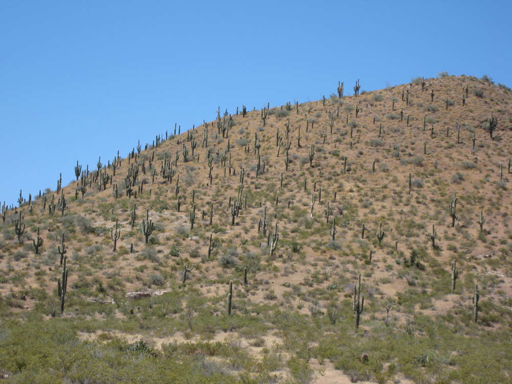 Friday, May 02, 2008 The Arizona wind gave us a break today. After 2 days (luckily, one of them was our rest day) of gale-force intensity, the winds were fairly calm today. We had been worried that our 77.5-mile day with 2 long climbs would have taken forever; as it was, it only took 11 hours. We hereby thank all the powers that were responsible for the reprieve. May they continue to be so kind. We also had an easy day navigation-wise - we were on US 70 all day. All in all, it was a good road, smooth, wide shoulder most of the day and not too much traffic. There was an alternate route that would have taken us on a rougher road with more climbs and would have had us camping around the lovely San Carlos Lake. As it was, we did see a glimpse of the lake from our road and we get to sleep in a motel bed tonight. We were pretty happy with our choice. We left Safford at 6:30 this morning and passed through the towns of Thatcher and Pima in rapid succession. All 3 were lovely towns with lots of stores and industry. We then passed several farms, most of which had hay growing in the field at various stages of production from just-plowed to ready-to-harvest. We saw a couple of fields being irrigated and fertilized. Both used a company called Fertizona, whose plant we had passed just outside of Pima. The Gila River ran along beside us for a good part of the day, between the farm fields and the mountains behind them. Several "washes", as they were called, ran from the Gila towards and under the highway, but nearly all of them were dry. The landscape was primarily mountains in the distance, canyon along the Gila River, and fields or scrubby, semi-arid shrubs and plants next to the road. We reached our first watering hole after 22 miles in Fort Thomas. The store was another one of these all-purpose stores, a combination gas station-restroom-grocery-hardware-pawn shop. The woman who ran the store was well acquainted with the Adventure Cycling groups that came through regularly and we had a pleasant chat with her. Soon after Fort Thomas, we entered the San Carlos Apache Reservation where we would be for nearly all the rest of the day. The reservation starts just before the town of Bylas which had an Apache Market - a new-looking grocery store staffed by Native Americans. We stopped for sodas mostly to support the store. We received friendly greetings and wishes for a safe trip. There were no other places to stop until the town of Peridot, some 25 miles later. Peridot was just before the first of our 2 long climbs and we saw the road rising up ahead of us as we stopped to refuel. We had several other friendly comments and inquiries about our trip there. Someone who saw us taking a picture of a nearby mountain told us it was called the Triplets (because of its 3 peaks) and said there was a road we could take up to it, but we had to pass on that. As we started up the hill out of Peridot, we passed a parked pickup truck with 4 young kids in the back who laughed delightedly at our bike and waved enthusiastically. Several cars who passed us beeped and flashed V-signs or waved as they went by. We didn't see many houses or farm animals, mostly very rough terrain with the usual desert plants and a few cute little lizards that darted around the rocks near the road. We saw warning signs about cattle every 5 miles for 20 miles, but didn't see a single cow. We did see a rabbit once, and several small birds, lots of pretty wildflowers, and lots of saguaro cacti - a couple of hillsides were covered with them! Near the end of the reservation there was an Apache Gold Casino and Resort - a big spread with several buildings, an RV park and a Best Western motel, surrounded by lots of tall palm trees. About 4 miles later, at the end of our second climb, we reached the town of Globe, our destination for the night. The elevation at Safford had been 2,920 feet; Globe's was 3,544 feet, only 500 feet higher but we had put in a total climb of 3,500 feet with all the ups and downs along the way. We arrived in Globe at 5:30, doing 77.5 miles in a little over 8 hours of bike time, a fairly respectable average, we thought, given the circumstances. |