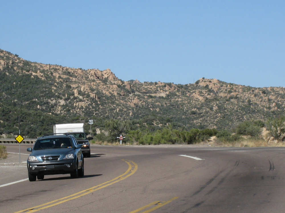 Saturday, May 03, 2008 We had a shorter day today with only one major hill. The winds were merciful to us again and were very calm all day. The day started out quite cool - 48 degrees - but went up to 90 by mid-day when we had gotten to the other side of the mountain. We had breakfast near the motel and found another biker about our age who was also trying to get an early start. He was going to be riding to Cholla (someplace we'll be passing through tomorrow) on an 85-mile ride with members of the local bike club. Sounded like a tough day's ride. We got underway at 6:45 and had an easy 6 miles or so before the big climb. We passed through the town of Globe, which had several houses built up on the hillsides and a copper and gold mining operation on some other hills. Mining seems to be the major focus around here. We went through 2 other towns in rapid succession, Claypool and Miami, both of which had mining operations. They were all operated by the same company that runs the Santa Rita Copper Mine that we saw in New Mexico (see April 28th). Soon after we left Miami, we began to climb slowly but surely. The grade was quite gentle at first, so we got a chance to warm up to it. It gradually increased to the 4-6% range. The scenery was quite stunning, particularly as we got up to the higher elevations. The mountains were made up of enormous rocks, some quite jagged and craggy, others round and smooth like stream pebbles. They must have been worn smooth by the wind; it would be very hard to believe these rocks had ever been under water. There was a fair bit of traffic, though, which detracted some from what was otherwise a pleasant ride. Just before the high point, we crossed the Pinto Creek on one of the highest bridges I had ever seen. We couldn't see any water in the creek but the gorge it formed was incredibly deep and had some great views. When we reached the high point (about 4600 feet), we found there was a little community up there. We were amused to see a sign that said Business District. There were 2 buildings that looked like they had been stores, long closed though. But there was one thriving business still going, and we got a picture of it. There were also some houses, mostly trailers, some of which seemed to be wedged into the huge boulders that were up there. It was quite a strange sight. We then began another nerve-wracking constantly-braking descent. Luckily, we had replaced the pads on the disk brake yesterday; they were already quite worn and I don't think they would have lasted through today. Part way down, the boulders became even more impressive in the area called Devil's Canyon. We stopped to take a number of pictures there. Shortly after that canyon, we went through a short tunnel, the Queen Creek Tunnel, through another mountain, and a mile or so later, we arrived in the town of Superior. Since it was nearly half-way to our destination, and the only other town before our destination, we decided to have lunch there even though it was fairly early. We ate at a small Mexican restaurant, of which there were at least 3 fairly close together. There were a couple of nice shops, selling antiques and Native American jewelry and crafts. Superior claimed to be at 2,888 feet, but it seemed much lower because we later climbed a bunch more to reach the Gonzales Pass, elevation 2,895. Just outside of Superior, we passed the Boyce Thompson Arboretum State Park, which looked beautiful with many varieties of yucca, cactus, and other flowering desert plants. Shortly after that, we came up to a jeep that was parked by the side of the road whose driver leaned out and called to us as we rode by. He had just passed us and pulled over to ask us about our journey. His name was Terry, he lived in Tempe, and he was an avid bicyclist himself, having done the Adventure Cycling Northern Tier a few years back, as well as several other major excursions. We chatted for quite a while about biking in the area. He invited us to stay at his place in Tempe for the night, but it was too far for today's stop and too short for tomorrow's. It turned out that the father and son bikers, Ian and Taran, that we met at the Kingston Lodge had stayed with Terry when they went through Tempe! He said he had heard that Ian & Taran had stayed at the lodge for several days to learn more about strawbale house construction from Catherine and Pete. Finally, Terry suggested that he ride with us a while tomorrow and show us a better way through Phoenix than the A.C. maps suggested. So we're looking forward to doing that. The rest of the ride was fairly uneventful. We went up the Gonzales Pass and down again (another steep descent, but not as long). Then, things leveled out and the road was either slightly downhill or level the rest of the way to Apache Junction, about 22.5 miles short of Tempe. The scenery along this stretch was beautiful too, with lots of desert plants and mountains in the background. The traffic was still fairly heavy and the shoulder here was very rough, so we tried riding in the road as much as possible - it made for a less than relaxing end to a not very relaxing day. As we approached Apache Junction, we went by several housing developments and small shopping plazas, all of them in a bright Southwestern style and all looking extremely new. Apache Junction itself had a very new look to it. We found our motel and got settled in at 2:30 (3 hours earlier than yesterday), having come 57.4 miles (20 short of yesterday) in 5 hours and 20 minutes of bike time. We realized that there was a bike shop in town and found out they closed at 5 pm on Saturdays, so we rushed over and got new chains put on the bike and picked up some replacement pads for the disk brake. It was a great bike shop and we had a pleasant chat with the owner and his helper while they worked on our bike. Then we went off to dinner and came back to work on the website. |
