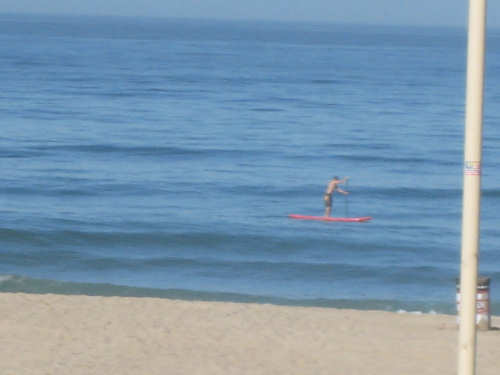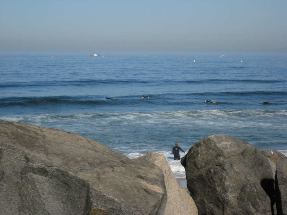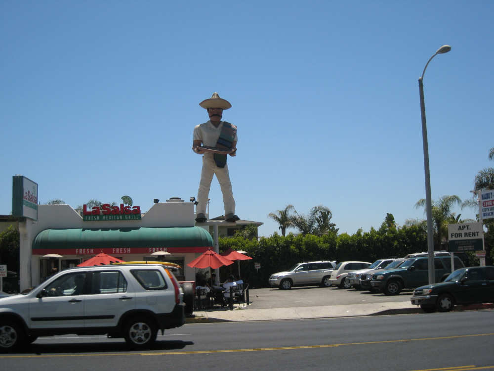 Saturday, May 17, 2008 After yesterday's bad experience with the bike path through LA, Pat swore he'd never get on one again. I finally sweet-talked him into trying the one Adventure Cycling recommended as an alternative to Route 1. I had also gotten some confirmation last night, from a fellow college alumna, that the bike path was pretty straight-forward. She also assured me that it would be easy to find because there would be a million people on it today, given it's Saturday. So we set out after breakfast in a local diner and found it quite easily. It was a very nice path, not so crowded that we couldn't move at a good pace, but definitely well-populated. There were several lovely shore houses right along the path and then a wide stretch of sand to the ocean. There were lots of surfers in the water in places, and we saw something new today - people standing on surfboards rowing with long oars, almost like a Venetian gondolier. We decided this must be a way to strengthen one's arms and legs for surfing. There was one obstacle on the path, a set of stairs we had to climb, but someone kindly offered to help us up them. The day was sunny and the beach was quite hot, but the ride was smooth and enjoyable. We went around a large marina, Marina del Rey, with some help from other bikes on the trail - this was the only tricky part of the trail - and ended up in the town of Venice. Venice was a very colorful town with brightly colored markets, street vendors selling all manner of arts and crafts, and some interesting sculptures and murals. We went past several state beaches and ended up at the Will Rogers state beach in Santa Monica. There the path ended and we turned back on Route 1. The highway was busy, but it had a good shoulder so it wasn't difficult riding. We soon came to Malibu which promised to be very scenic, but the road was being repaved and it was currently scraped of the old asphalt, so the surface was very rough. This went on for 4 or 5 miles with a little break of smooth surface in the middle. This spoiled our appreciation of Malibu's scenicness somewhat, but there were definitely some nice houses in town, several expensive restaurants, and some beautiful beaches. We didn't really see the beach until near the end of town, since the houses blocked the view from the road. Many of the houses along the beach overhung the water. As we headed out of Malibu, the ocean was still hard to see in many places, either because of the terrain or landscaping, or because there were so many cars lined up in front of it. We could always tell where there was beach access by the cars lining the road. The terrain became more mountainous, and there were several impressive canyons along the route. We met a lone biker who was almost as loaded down as we were (he has the unique distinction of being the only bike slower than we were!). He told us that one of the canyons we passed was the site of a very bad wildfire last November that destroyed a lot of houses. Clearing brush is taken very seriously here, and we saw workers doing so in a couple of places. The combination of the tall mountains and their stunning foliage on one side, and the beautiful ocean on the other was quite delightful. We had planned to meet Heather and Kevin - Heather being the sister-in-law of Pat's daughter Sarah - somewhere in Point Mugu State Park and as we neared our destination, we saw Heather flagging us down. As they live about 20 miles off route, they graciously offered to drive us in their car and pickup truck to their home for the night. We spent a pleasant evening together, ate lasagna and salad that Heather prepared for dinner, played a bit with their 2-year-old daughter, Katie, and then finally got to work on the website. We biked almost 50 miles today in almost 5 hours, a decent average considering the hilliness on the second leg of our trip. Tomorrow, they'll drop us off back on route again and we'll head off to Carpinteria. |